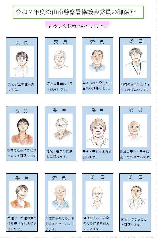 令和7年度松山南警察署協議会委員のご紹介(似顔絵)
