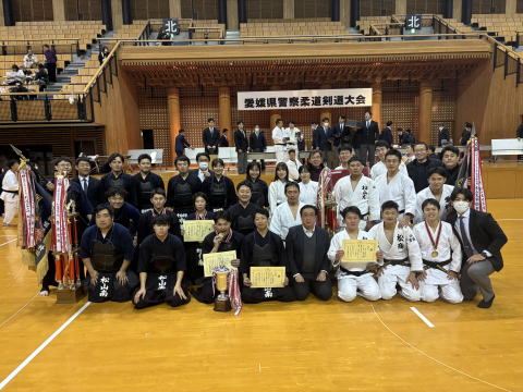 松山南署は、7人の選手で争われる団体A組の部に参加し、 南署創立以来、初めてとなる柔道・剣道団体アベック優勝を果たしました。