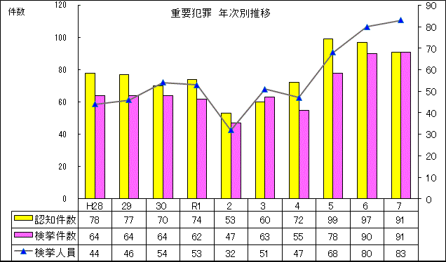 ・検挙件数の罪種別では、前年に比較して、殺人は同数で、不同意わいせつは増加し、強盗、放火、不同意性交等は減少している。