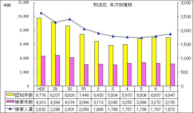 | 凶悪犯・粗暴犯・窃盗犯・知能犯・風俗犯・その他刑法犯をいう | |